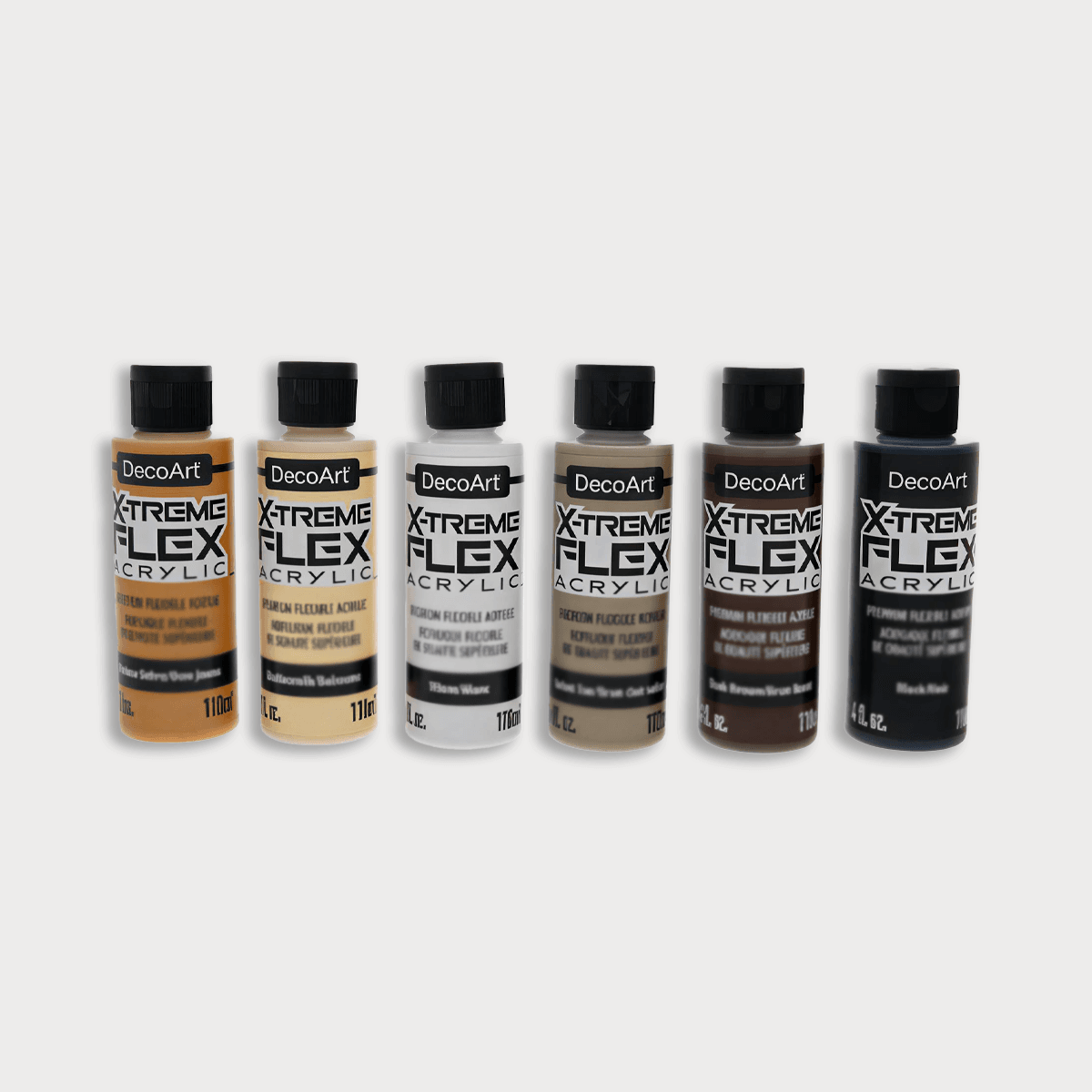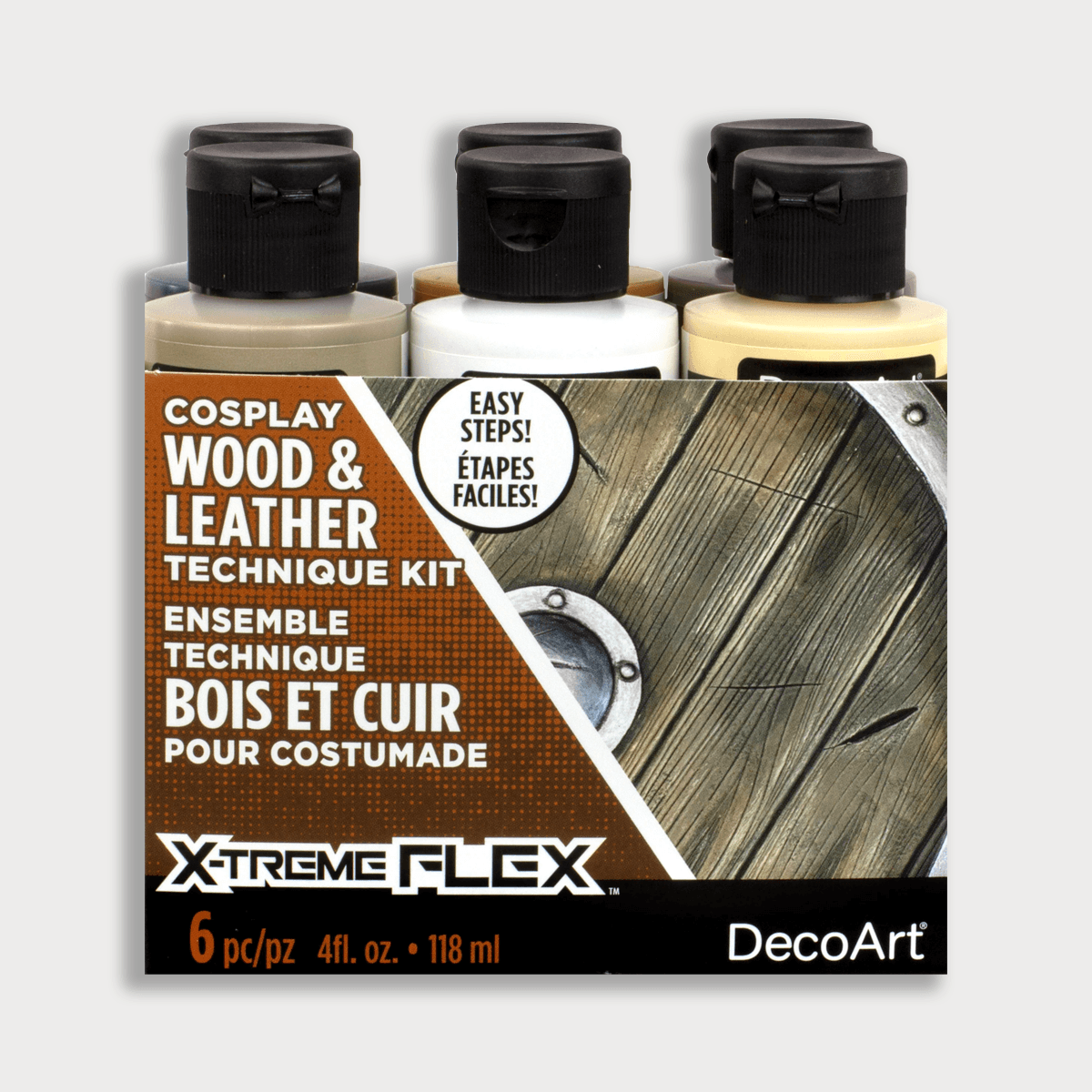 With the DecoArt X-treme Flex Cosplay Wood & Leather Kit, you get a complete set of professional acrylic paints designed for painting wood, 3D prints, leather, EVA foam and thermoplastic materials. This kit contains six carefully selected colours that allow you to create realistic wood and leather effects. Perfect for costumes, LARP props, cosplay weapons, shields, accessories or theatrical productions.