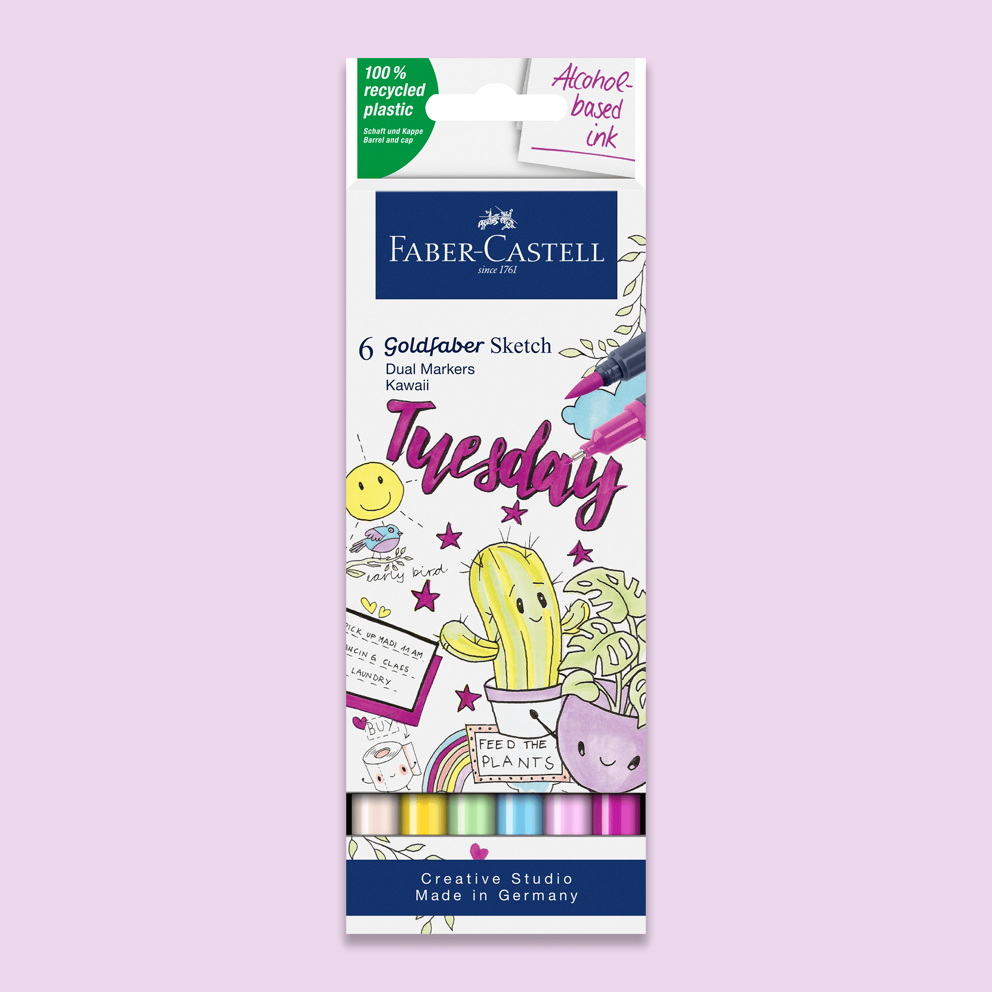 The ink is smudge-proof, water-resistant and dries quickly. High coverage through repeated application of the colors and streak-free blending. Caps and holder are made of 100% recycled material and may show color variations due to production. Box of 6 colors: 382/107/312/164/119/125.