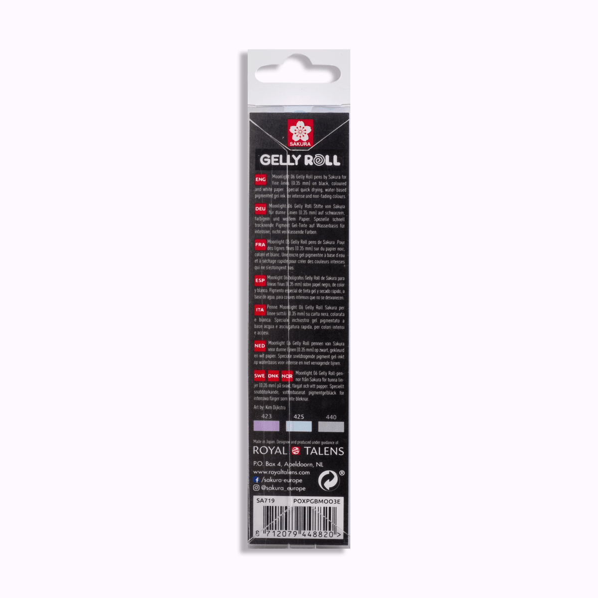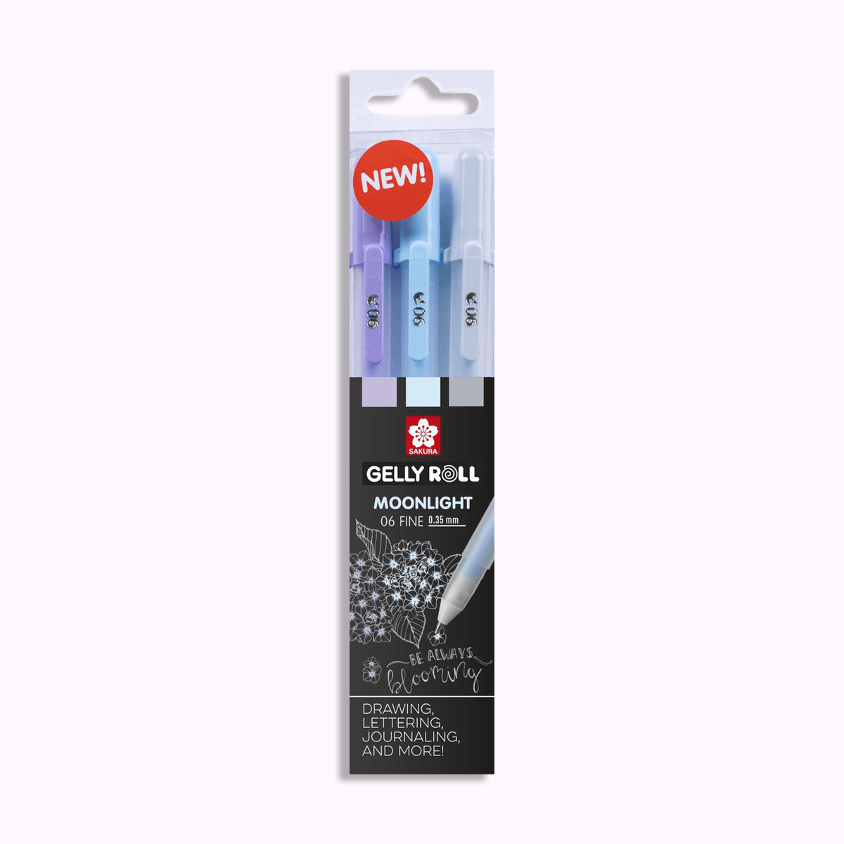 The Sakura Gelly Roll Moonlight 06 Calm set is a carefully curated set of 3 gel pens with soft, soothing Moonlight colors, ideal for serene illustrations and creative accents. The intense, clear ink is specially designed to be beautifully visible on both light and dark paper, beautifully highlighting quiet designs and fine details.
