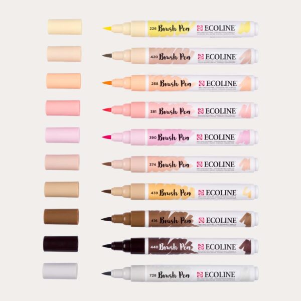 Elke brush pen is gevuld met vloeibare aquarelinkt en voorzien van een soepele, flexibele penseelpunt.
