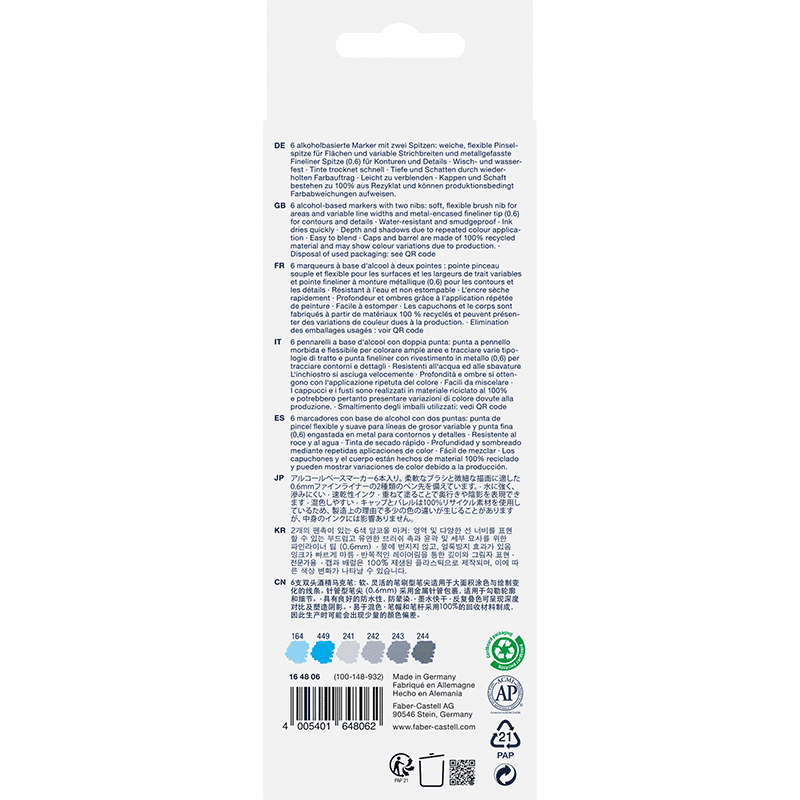 De inkt is veegvast, waterbestendig en droogt snel. Hoge dekking door herhaaldelijk aanbrengen van de kleuren en streeploos te blenden. De doppen en de houder zijn gemaakt van 100% gerecycled materiaal en kunnen kleurvariaties vertonen door de productie. Doos met 6 kleuren: 164/449/241/242/243/244.