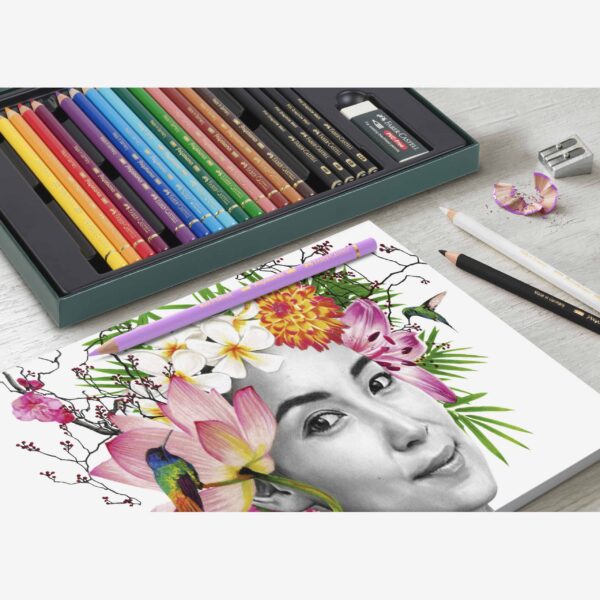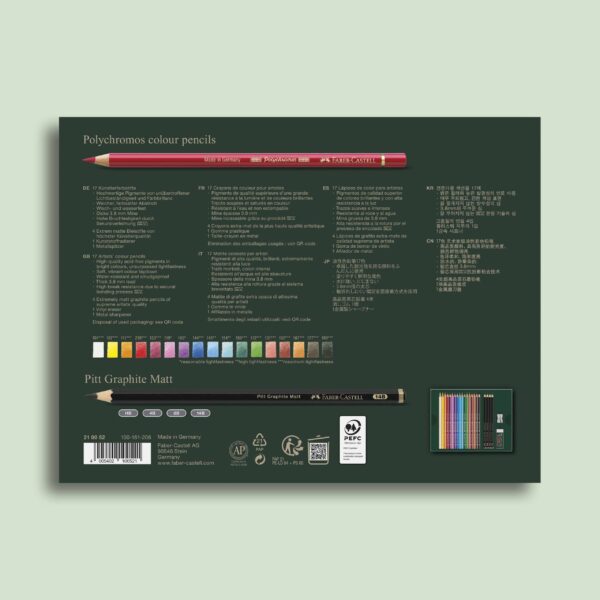 - Deze set bestaat uit 17 Polychromos kleurpotloden, 4 Pitt Grafiet Matt potloden, 1 metalen puntenslijper en 1 PVC-vrije gum.