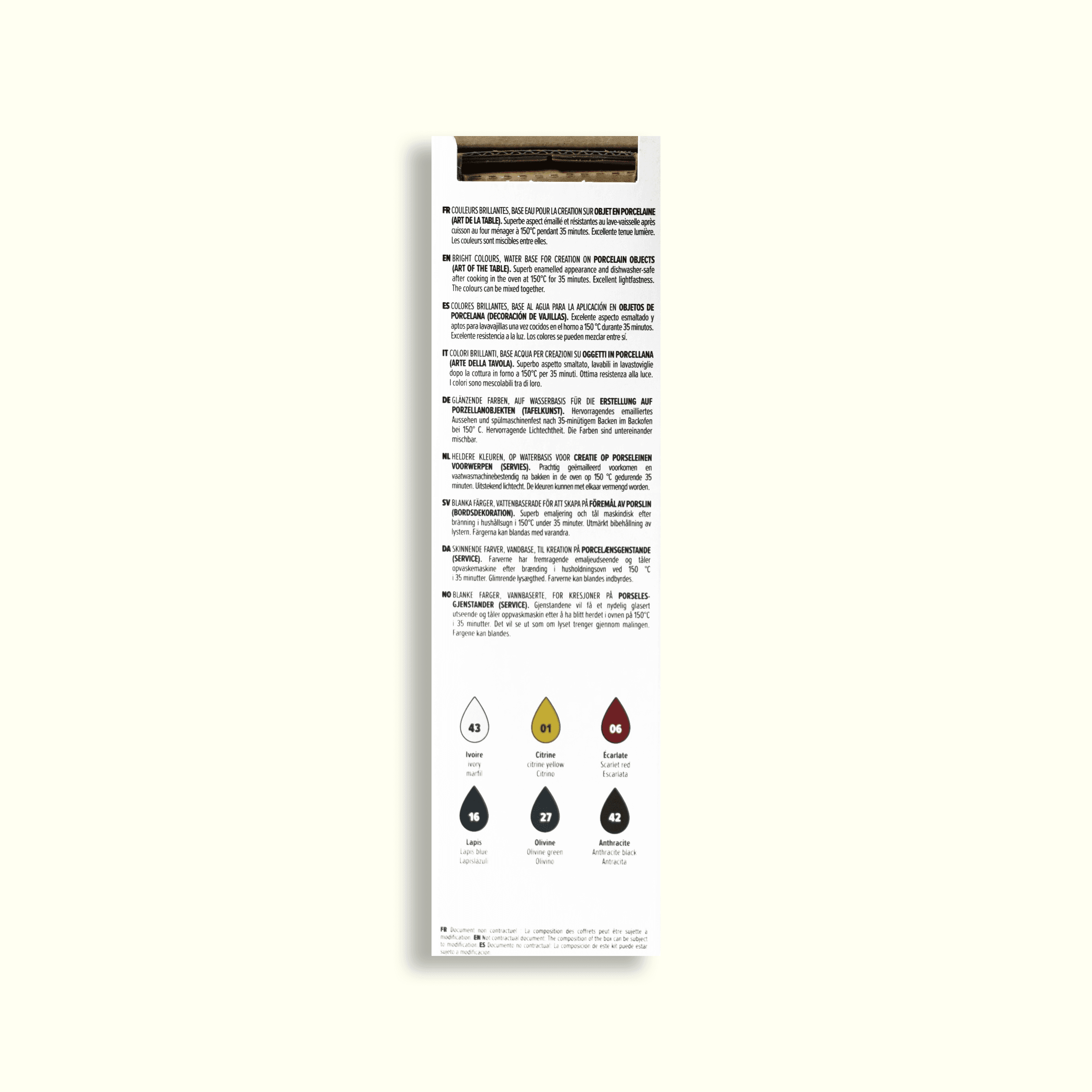 43 Ivory | 01 Citrine | 06 Scarlet Red | 16 Lapis Blue | 27 Olivine Green | 42 Anthracite Black