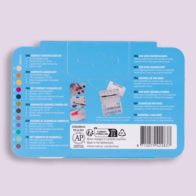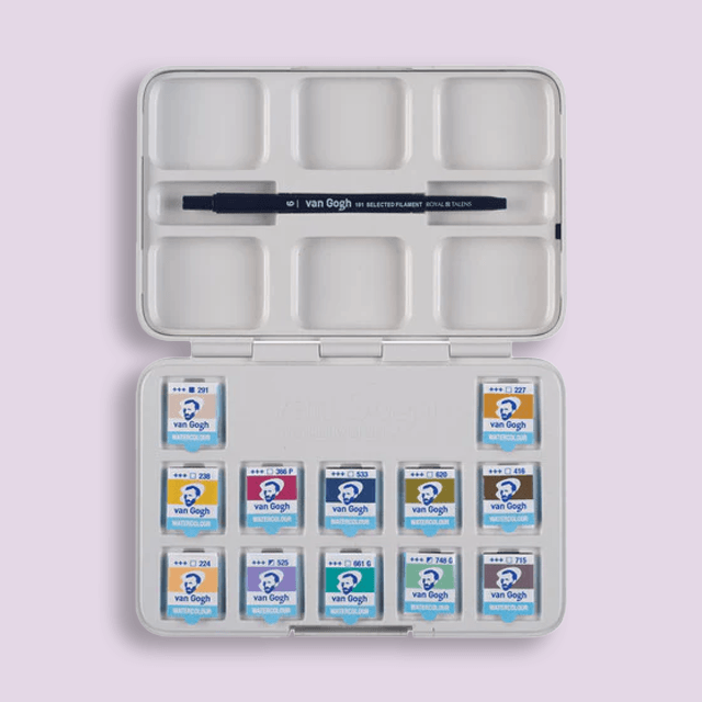 Of je nu schildert in een schetsboek of op aquarelpapier, met deze Van Gogh pocketbox heb je altijd de essentie van aquarel bij de hand.