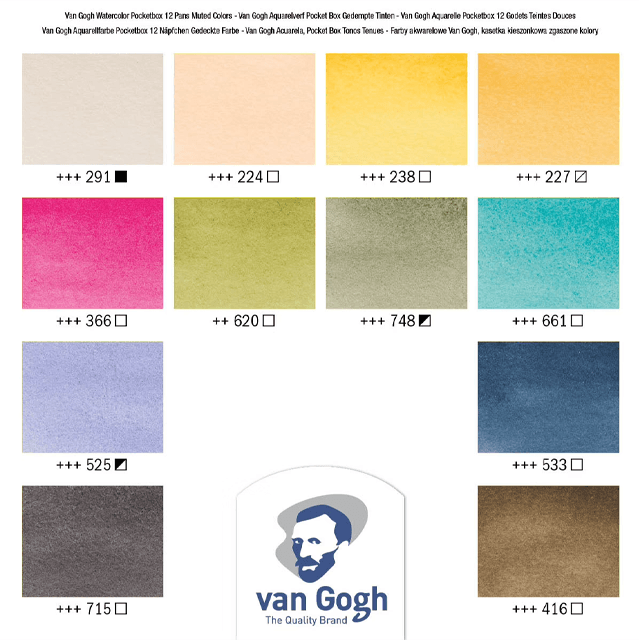 Ervaar de kracht van kleur met de Van Gogh Pocket Box Gedempte Tinten. Deze compacte aquarelset bevat 12 kleuren in halve napjes